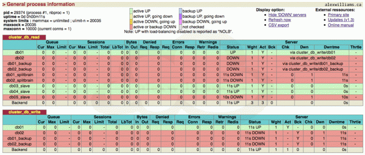 I’ve designed a slightly more complex HAProxy configuration file which load-balances requests to MySQL databases. It detects failures such as broken replication and offline servers, and adjusts the availability of servers accordingly.